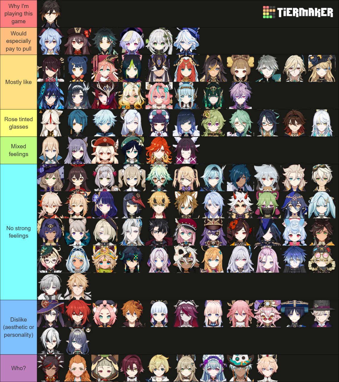 Kinda surprised myself that the majority of Liyue characters fell under the rose tinted glasses (ie. extension of feelings of their CN-style design as Liyue characters), while only fewer made it higher up as liked for being characters... While the like category has a pretty large number of Sumeru and Natlan characters (hm... probably one of the reasons I also rank these two nations pretty high up).